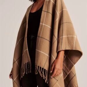 Abercrombie & Fitch Women’s Tan plaid fringe shawl knit cardigan Poncho