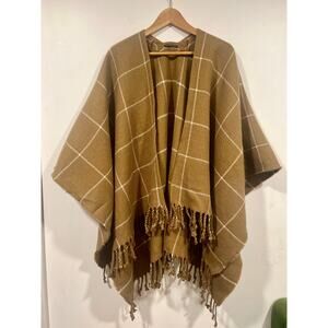 Abercrombie & Fitch Women’s Tan plaid fringe shawl knit cardigan Poncho OS