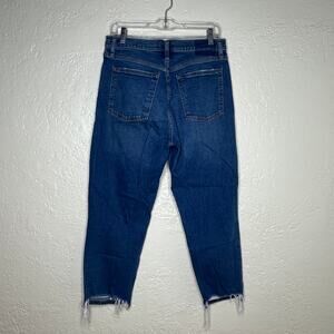 Step into effortless style with these Abercrombie & Fitch Women's The Mom Jeans. Designed with a flattering high-rise fit, these jeans feature a zip fly, distressed details, and a raw hem for a modern, laid-back look. Crafted in classic blue denim with just the right amount of stretch for comfort. Perfect for everyday wear, dressed up or down. Size 30/10 Regular.
