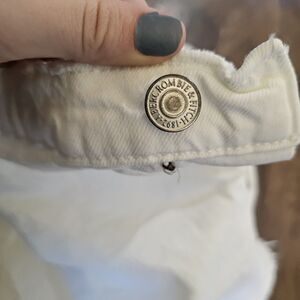 The product is a pair of Abercrombie & Fitch Women's The Mom Shorts in size 35/20. These high-rise white denim shorts feature a zip closure, fringe accents, and a 5-pocket design, making them suitable for travel, activewear, and casual occasions. With a regular fit and a waist size of 35 inches, these shorts are a classic and stylish addition to any woman's wardrobe. Made from 100% cotton, they are machine washable and perfect for all seasons. Pre-owned condition