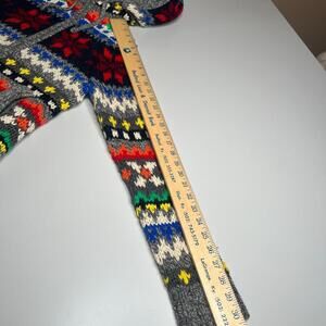 Vintage-style Abercrombie & Fitch women’s hoodie sweater in size Small. Features a chunky knit Fair Isle pattern in vibrant colors on a gray base. Made with a warm wool-cotton blend, full zip closure, drawstring hood, and front pockets. Quilted lining for added warmth. Made in China. In excellent pre-owned condition—perfect for cozy winter wear or retro layering style.