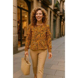 Sun kissed and full of charm. This Abercrombie and Fitch blouse blends retro paisley print with a flirty mustard palette. Features soft ruffle trim at the chest and sleeves, a back keyhole button closure, and a breezy silhouette that drapes beautifully.
