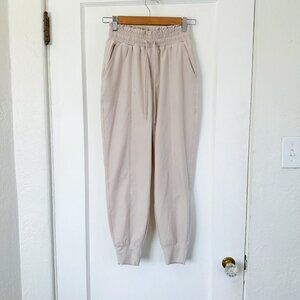 Our high rise active joggers in our lightweight and drapey, stretch-enhanced motionTEK fabric. Features a flattering channeled stretch waistband with exterior drawcords, side pockets and ribbed cuffs.