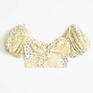 Charming matching set crop and skirt with floral design. Features yellow and blue hues. Stylish and playful for casual wear.