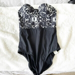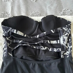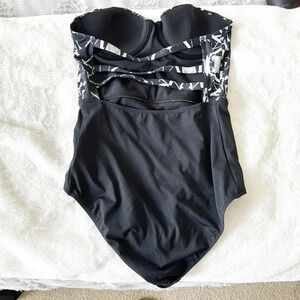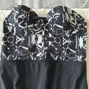Black and white color block printed strapless one piece swimsuit. Built in cups with underwire and light padding. Open details in back. No flaws, great preowned condition