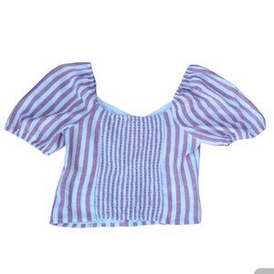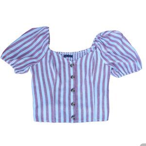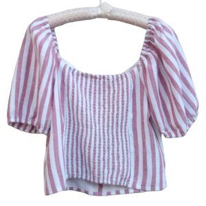 In good preowned condition. Beautiful rose and white stripes, puff sleeves and decorative front buttons. Buttons do not open. Color most accurate in 1st 3 photos. Made of 53% linen, 47% viscose. Measurements in photo. From a smoke free and cat/dog friendly home. #(11)