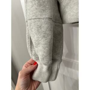 This is a gently used Abercrombie & Fitch cropped hoodie in a versatile gray color. It is a size small. Perfect for layering or wearing on its own, this hoodie offers both style and comfort. The cropped length adds a trendy touch, making it a great addition to your casual wardrobe. Don't miss out on this fashionable and cozy piece! There is a VERY SMALL untreated spot on the bottom of the sleeve (see photo), hence the condition .