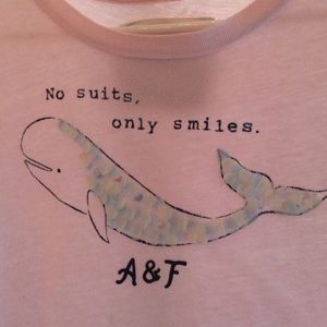 VERY soft light pink short sleeve fitted tee with a whale graphic and the words "No suits, only smiles. A&F"