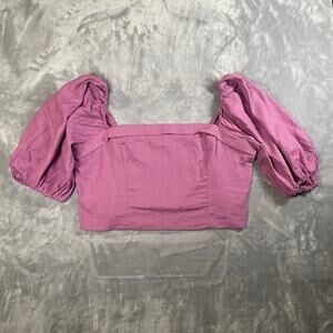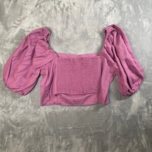 Pretty purple lilac peasant crop top. Fitted bodice, smocked in the back for shape and fit. Square neckline. Puff sleeves. Soft linen material. Size XL.