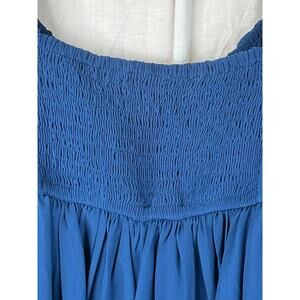 The dress features a flattering babydoll silhouette, back ruching, sheer sleeves, a beautiful blue color and is lined.