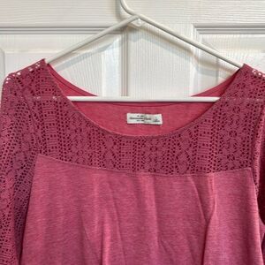 Pink 3/4 sleeves shirt with crotchet detailing on the front and sleeves. 60% cotton 40% polyester