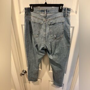 Size 14 only worn one time. Smoke free home. Distressed light wash. Moderate stretch very high rise. No stains or defects