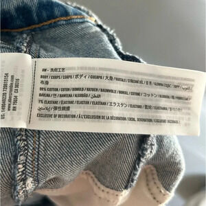 Vintage stretch denim in a medium wash, with frayed hem. Angled asymmetrical cutout on top.