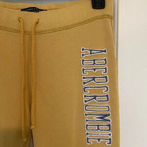 Women’s Abercrombie & Fitch sweatpants. Sweatpants are yellow in color with gray & white wording down the leg. Has adjustable waistband with drawstring. Cuffs of legs are cuffed & sewn in place. Fleece lined. Size XS. Smoke free home!