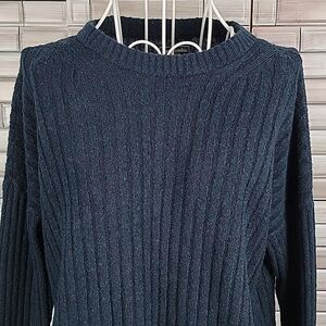 Acrylic nylon spandex blend large ribbed knit crewneck sweater by Abercrombie & Fitch. Lovely styling with change of directions in the weave patterns at the draped shoulder and split him. Great pre-owned condition.