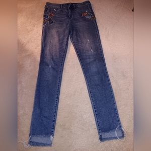 Excellent preowned condition High Rise distressed floral and bird embroidery on front and back of jeans 3 functional pockets Faux front pockets Button and zipper closure Frayed high low hems