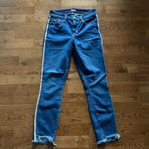 Darker wash blue jeans, skinny fit, ankle length, raw/chewed hem. Ribbon stripes down legs.