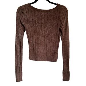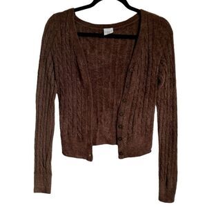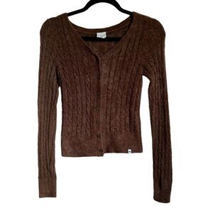 Stylish brown cable knit sweater with button front. Ideal for layering.