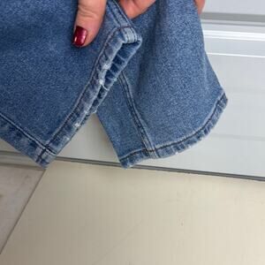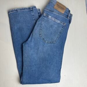 Crafted from a classic blue denim, these Abercrombie & Fitch jeans showcase a straight leg design with intentional distressing for a vintage vibe. The medium wash and frayed hem enhance their casual, worn-in charm, making them a stylish choice for everyday wear.