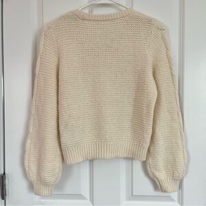 Adorable sweater that’s in excellent condition! No flaws. Super soft and cozy. Cable knit design in front and on the sleeves.