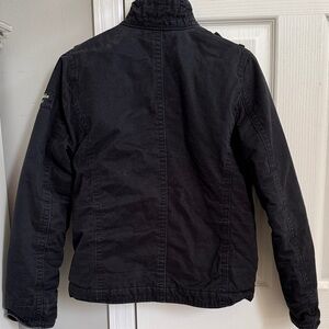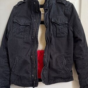 Stylish dark jacket with multiple pockets. Military-inspired design. Comfortable and versatile.