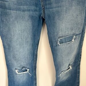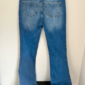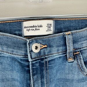 Abercrombie Kids medium wash high-rise flare jeans, size 17/18 Long. Features a flattering high-rise fit, flare leg opening, and stylish distressing for a worn-in look. Classic five-pocket design with zip fly and button closure. Perfect for school, casual wear, or weekend outfits. Pre-owned in great condition.
