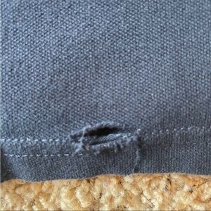Stains. Small rip on the Bottom Back Hem of Polo (see pic). Rip can be easily sewn.