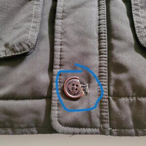 Green coat with faux fur lining throughout - zippers and buttons - last 2 pics with blue circles show button button is chipped (still works) and last pic shows where fabric is bonded at seam- can take fur cuff off hood - coat weighs 2lbs 9ozs - sleeve is 22 inches - shoulder2shoulder is 14.5 inches - length is 25.5 inches (2 pics)-pit2pit is 19 inches (2 pics)- 100% polyester - Made in Vietnam