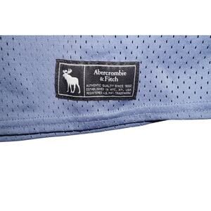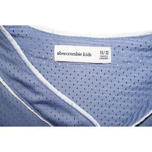 Abercrombie Kids short sleeve mesh baseball jersey shirt in a soft periwinkle blue color. Features a full button-up front, contrast white piping, and “Abercrombie New York” printed at the chest. Lightweight and breathable athletic mesh fabric. Perfect for layering or wearing on its own. Youth size 11/12.
