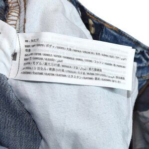 Gently pre-owned. Some stretching in the hip area as shown, but no rips, holes, or stains beyond intended distressing. Clean and wearable.