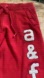 Abercrombie Kids unisex size large sweatpants. Pants feature a 72/28 cotton/poly blend red fabric; exterior draw string waistband; front open hand pockets;,wide legs; and large a&f appliqué logo down front left leg. Some wear on waistband, and right pocket, slight separation on leg hem, small mark on back right cuff, 2 small holes on back left side (see pics). Good preloved condition from a smoke free home. Refer to pictures/video for measurements/condition.