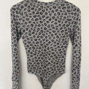 Gently worn and in excellent condition. This soft knit bodysuit from Abercrombie features a subtle gray and charcoal leopard print on a stretchy ribbed fabric. The crew neckline and long sleeves offer classic comfort, while the snap closure at the bottom ensures a smooth, tucked-in look.