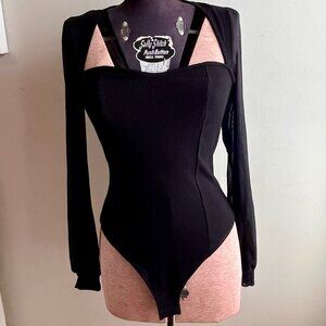 Top: Lulus Sweetheart Ribbed Bodysuit, Size M, long mesh balloon sleeves, ribbed knit body, snap closure.