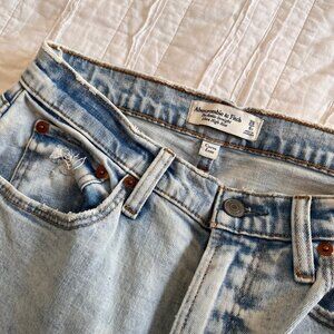 Jeans: Abercrombie & Fitch Curve Love Ultra High-Rise, Size 28, light wash, heavy distressing with raw hem; snug waist/hip fit to reduce gapping.