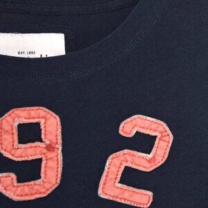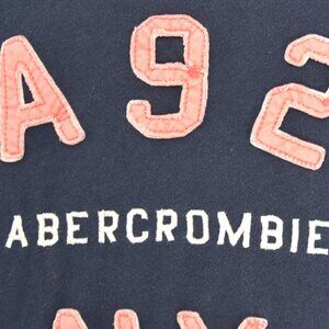 This Abercrombie & Fitch short sleeve tee delivers classic collegiate charm with a Y2K-era twist. The navy body is contrasted with varsity-style terry patch lettering in salmon pink and white, spelling out “A92 ABERCROMBIE NY” across the chest. Made from a soft cotton-poly blend, this fitted t-shirt has subtle wear and light pilling that enhances its vintage 2000s character. Size XL (tagged).