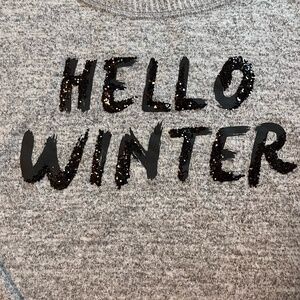 This sweatshirt is super soft and can be worn as lounge wear, athleisure, or pajamas. The "Hello Winter" text has some black glitter on part of the lettering. It's a bit oversized and hits right below the waist. There is some very mild pilling on the cuffs.
