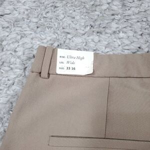 Women's Abercrombie Ultra High Rise Wide Leg pleated front dress pants in beige or tan. It has the paper waistband tag as shown in photos, but missing the paper hang tag. The pants have no flaws noted. Women's size 16 or 33, real measurements shown in photos with pants laid flat:
