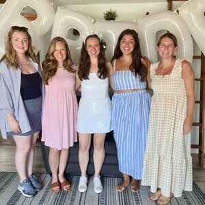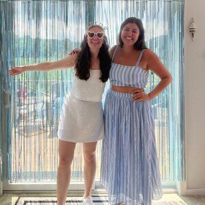 Adorable fully sequined crop top and skirt set (skirt has built in shorts!). Absolutely adored this outfit on my bachelorette. Only worn the one time, so it's in excellent used condition! Top is a small and bottoms are a L. I am normally a L in tops, DD, and an 8/10/L in pants. The top was very oversized so I sized down for a slightly more fitted look.