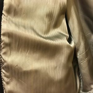 Dark green wool jacket with gold leather trim. Satin lining with front pockets. Great condition. Similar to Green Bay Packer colors (only if you are a fan of course)!