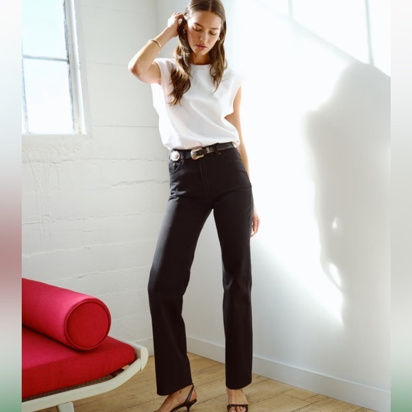 These black straight jeans from Abercrombie & Fitch offer a timeless look with their classic cut and uniform wash. Crafted from high-quality denim, they provide a comfortable fit and a sleek appearance suitable for any casual occasion. Featuring a crossed waist and high rise.