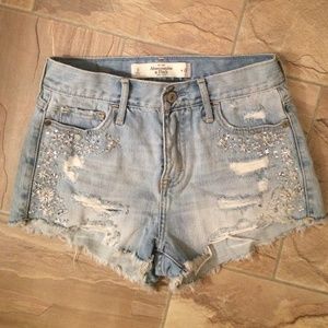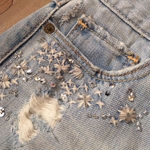 High waisted denim shorts in distressed style with embellishments. In perfect condition. Women size 0, waist 25. No rips or holes (other than the original distressed areas). Selling as is. Valid for bundle discount.
