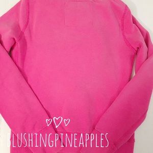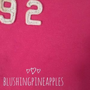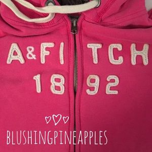Soft pink hoodie with a zipper down the middle. Perfect for those movie nights with jeans and chucks. 'Abercrombie 1892' in white on the front. No visible stains or holes. Pocket on either side of the zipper.