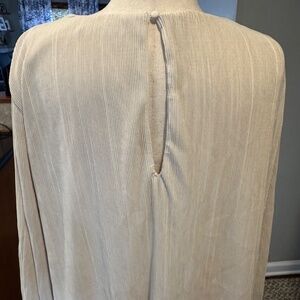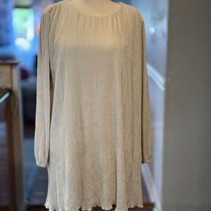 Satin Plisse Easy Mini Dress in a lightweight fabric and trapeze silhouette, featuring a belt for a more fitted look. Elastic cuff sleeves and high neckline with center back keyhole closure for a perfect fit. Machine washable. Only worn once and is great condition.