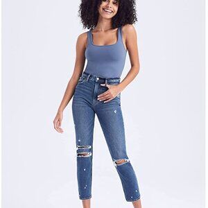 A classic, feel-good style this season is the Abercrombie Fitch Knee Destroy Mom Jeans. This high-rise style is a distressed dark wash with frayed hems and slits at the knees. Skinny fit through waist to ankle. Belt loop waistband with a button-zip fly closure. 5-pocket construction. Cropped length. 99% cotton, 1% elastane.