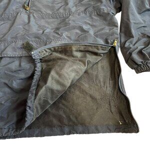 Abercrombie & Fitch anorak jacket, navy blue nylon, pullover, 1/4 zip and side zipper, hooded, pockets, adult XL, pit to pit: 26", length: 29.5", preowned and shows wear on the mesh lining - see photos