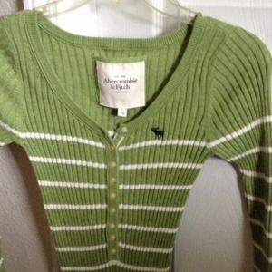 Green with white stripes that's buttons half way Down with quarter length sleeves. Only worn once