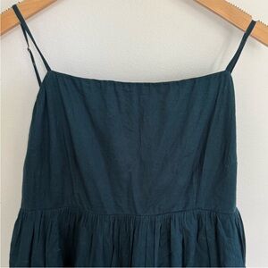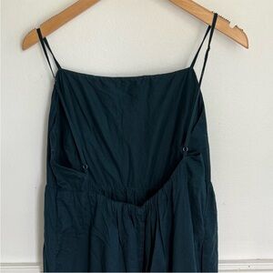 Low back detail, adjustable straps, teal color lightweight. Lined and has decently sized pockets!