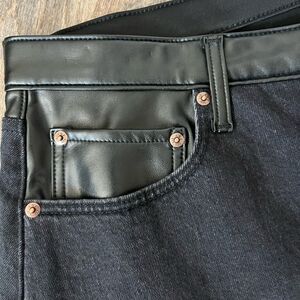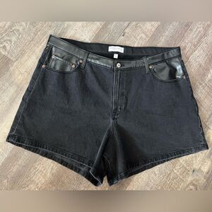 This listing is for a NWOT's Abercrombie and Fitch Curve Love High Rise Dad Short in black denim/vegan leather in size 35/20. These shorts feature a high rise with a relaxed fit throughout the hip and thigh, and a 5-inch (13 cm) inseam. Vintage stretch denim in a dark wash, with clean hem.