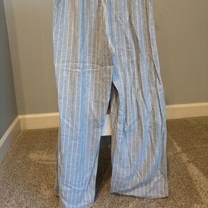 Abercrombie high waist linen pull on pants in blue white strap in size Medium Long Longer pant leg Brand new. never worn. Still has tags