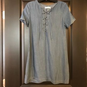 Drapey chambray denim fabric. Medium wash. Round neckline with lace up details. Short sleeve shift fit. Worn twice. Fiber content is 100% lyocell so feels super soft and buttery